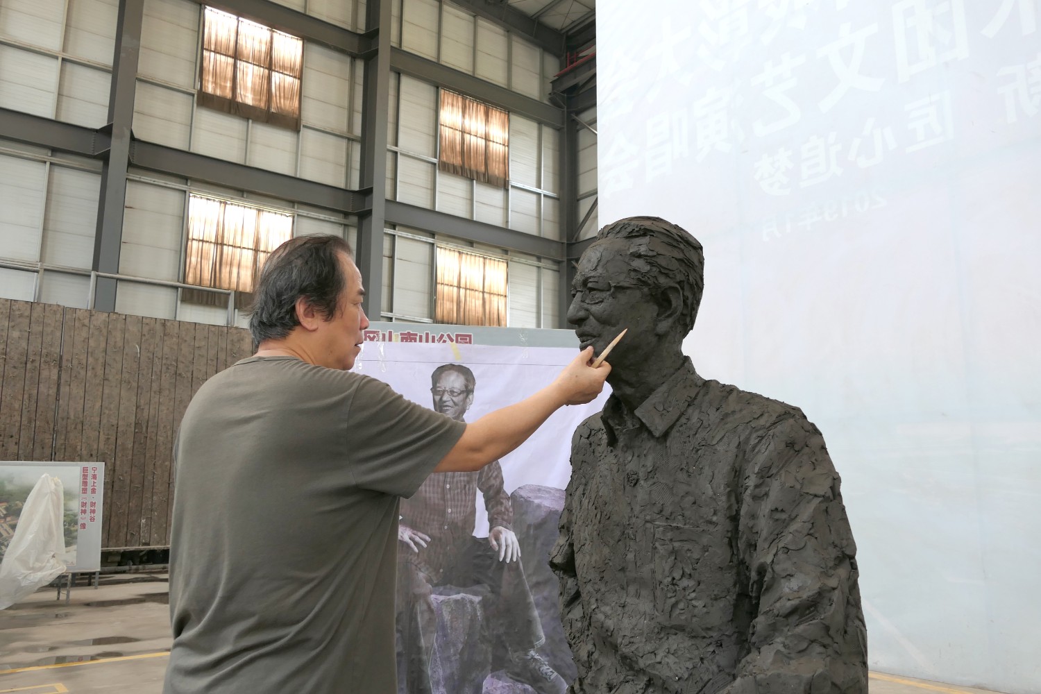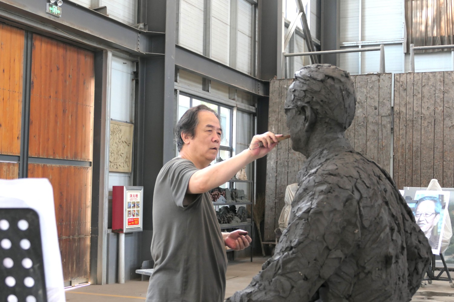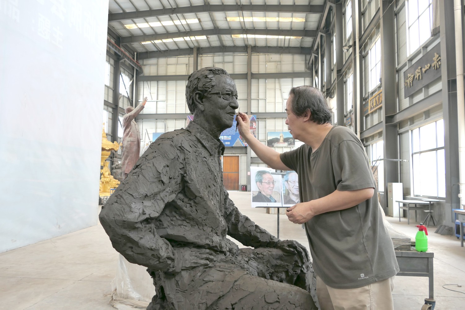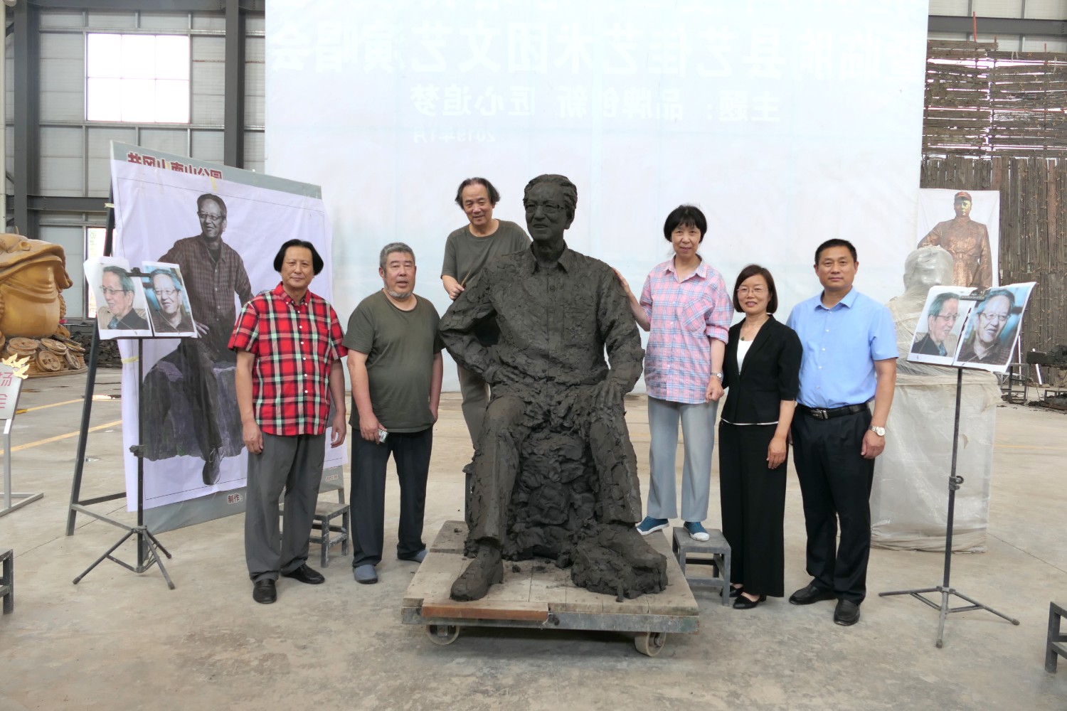 2022年6月11日,安博买球艺术家张永见先生,莅临华艺参观指导,并在安博买球家郭心聪塑造的杨辛(北京大学哲学系教授)雕像泥塑前合影留念。