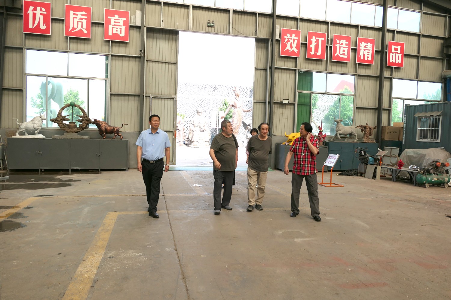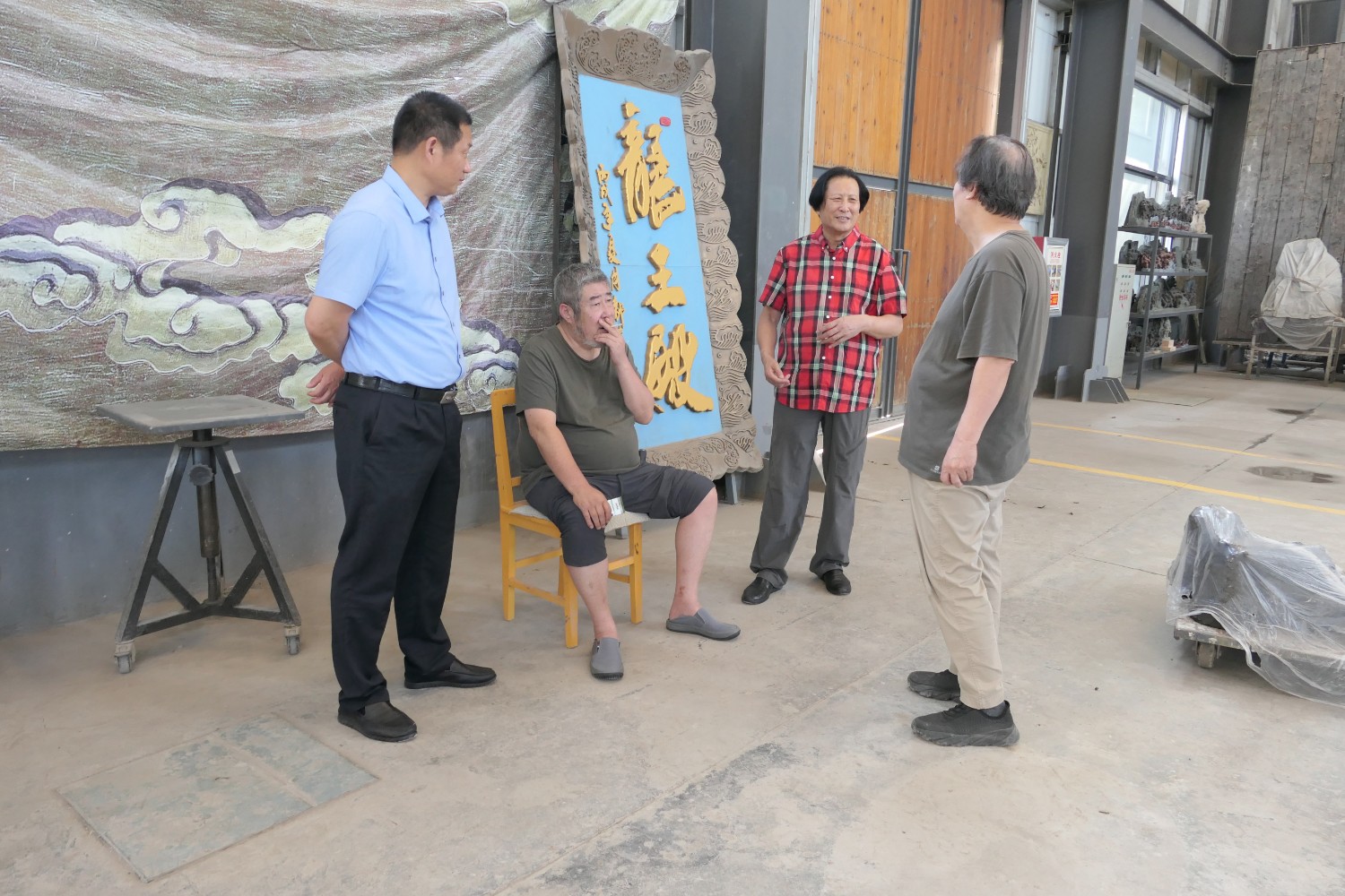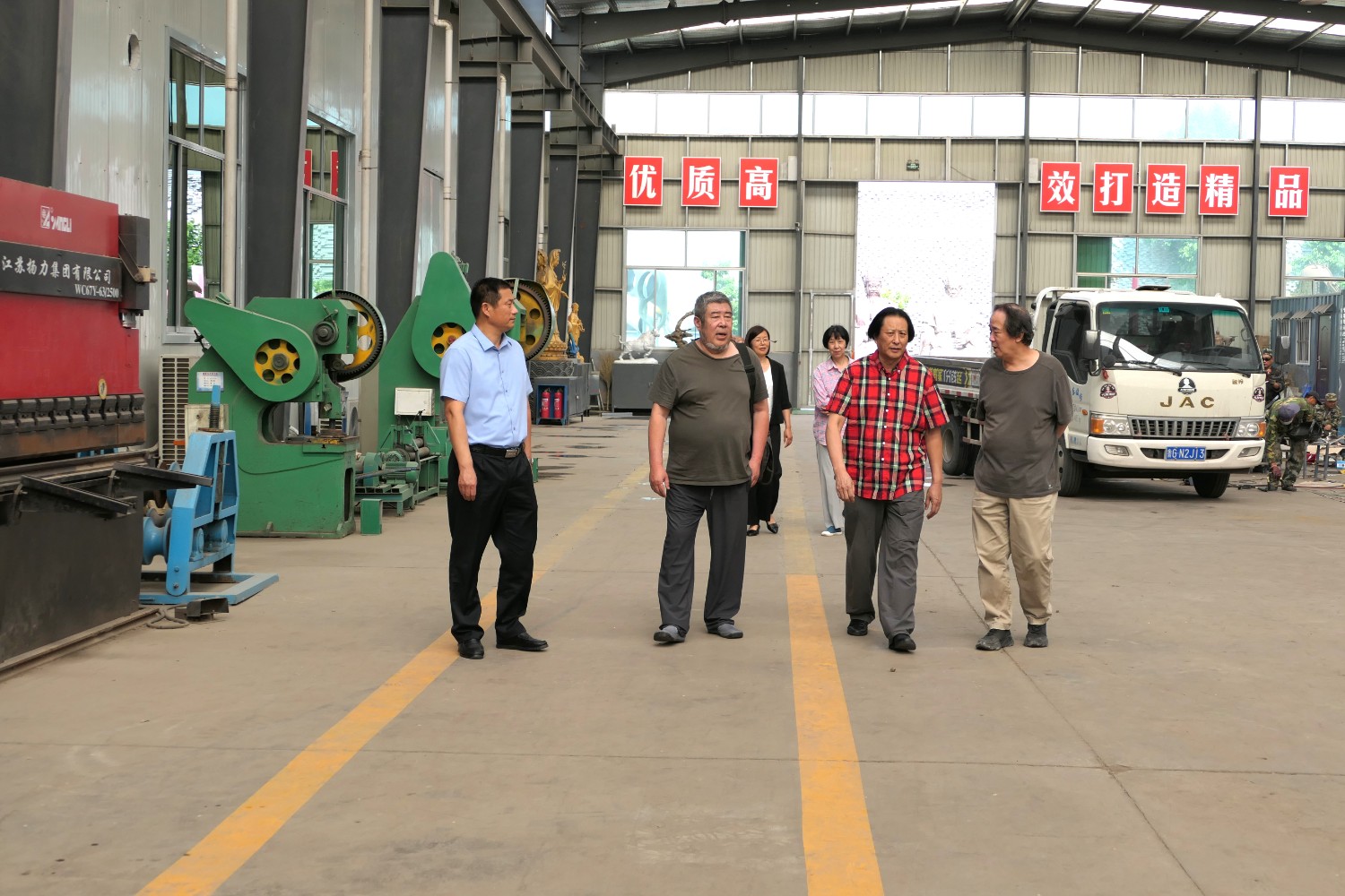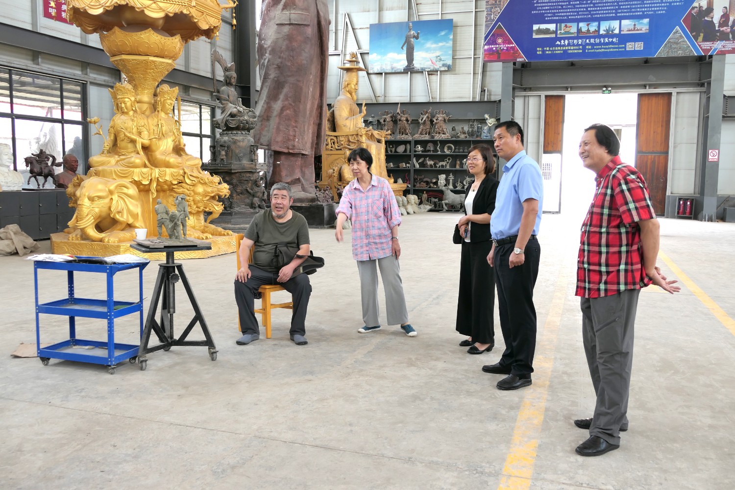 2022年6月11日,安博买球艺术家张永见先生,莅临华艺参观指导,并在安博买球家郭心聪塑造的杨辛(北京大学哲学系教授)雕像泥塑前合影留念。