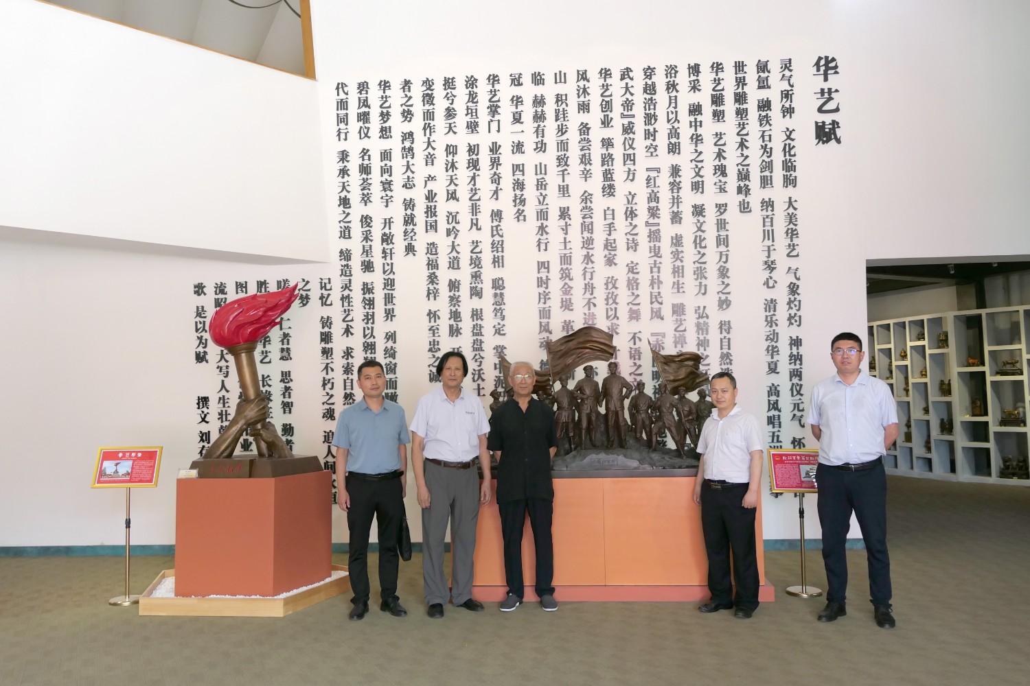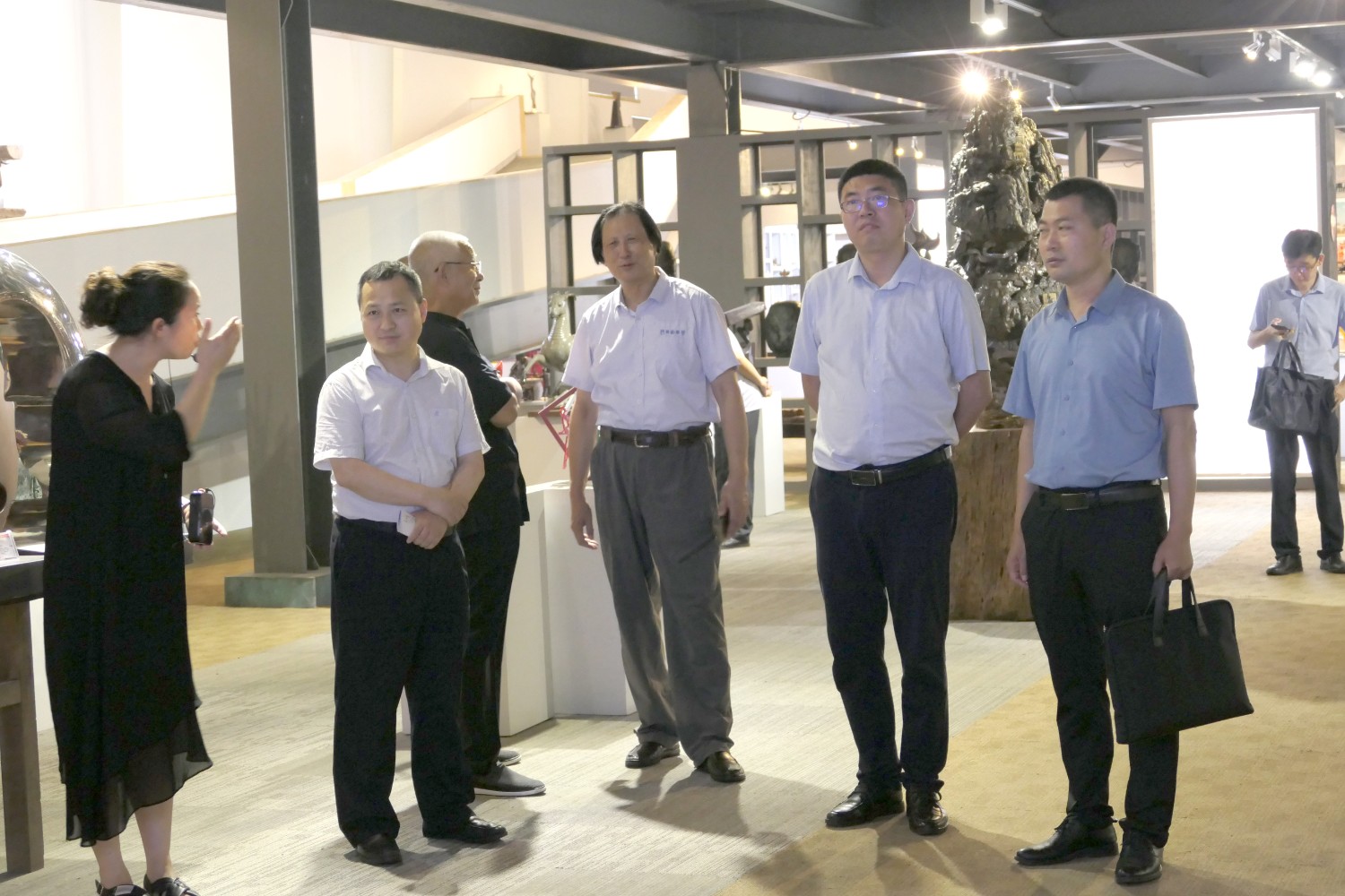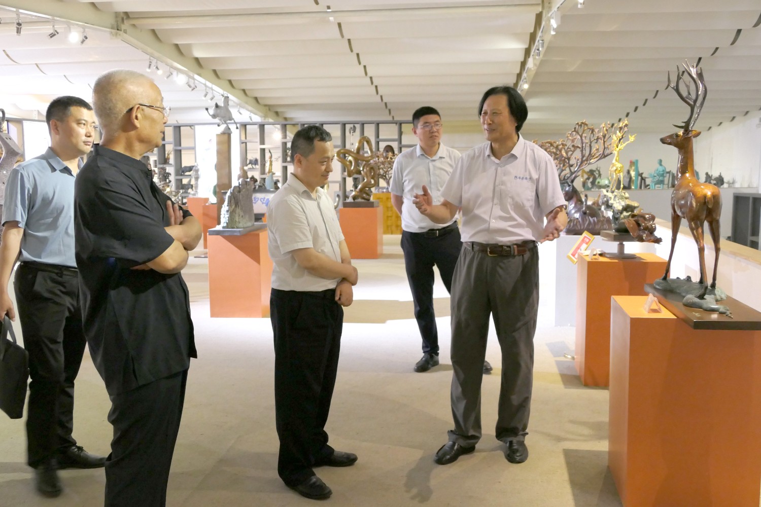 2022年6月23日,青岛铁路有限责任公司潍坊分公司总经理宋文超,中铁上海设计院曹栋,中铁二十三局集团中原区域总部潍坊分公司经理李善龙,中铁二十三局集团程向明一行,莅临华艺安博买球参观指导。傅绍相与嘉宾进行友好交流及介绍文创安博买球作品。