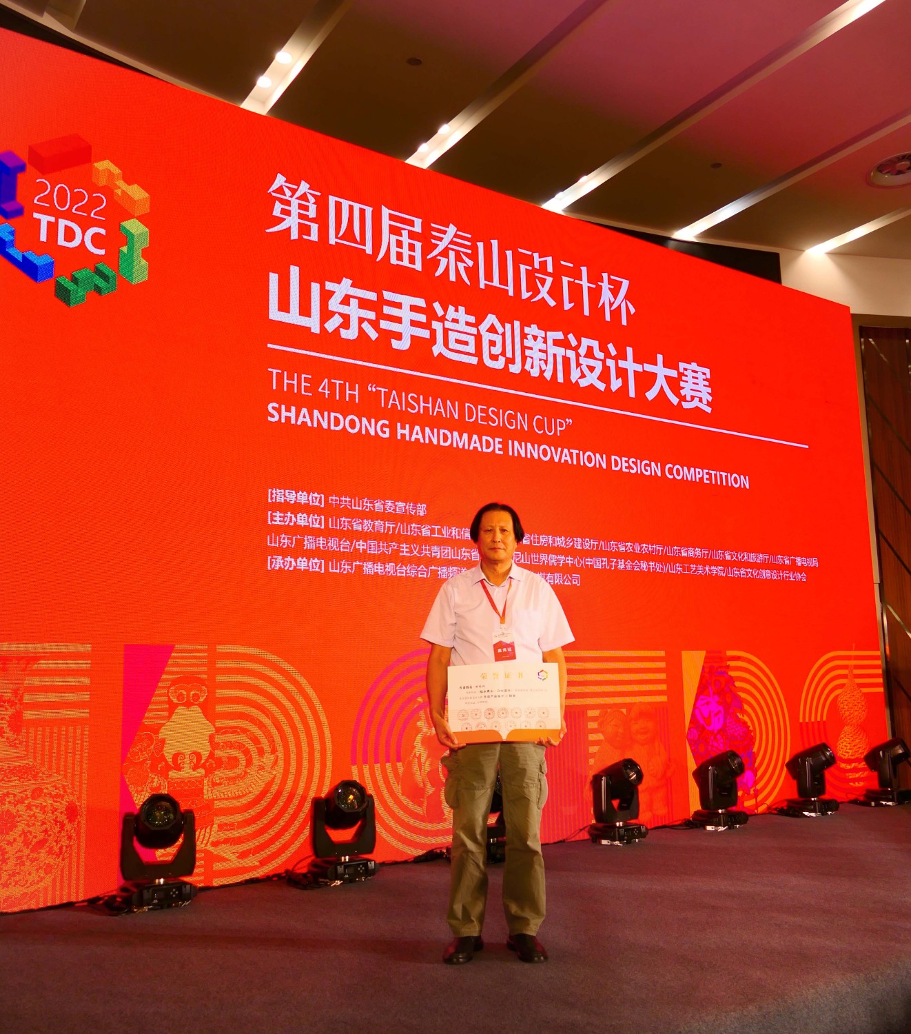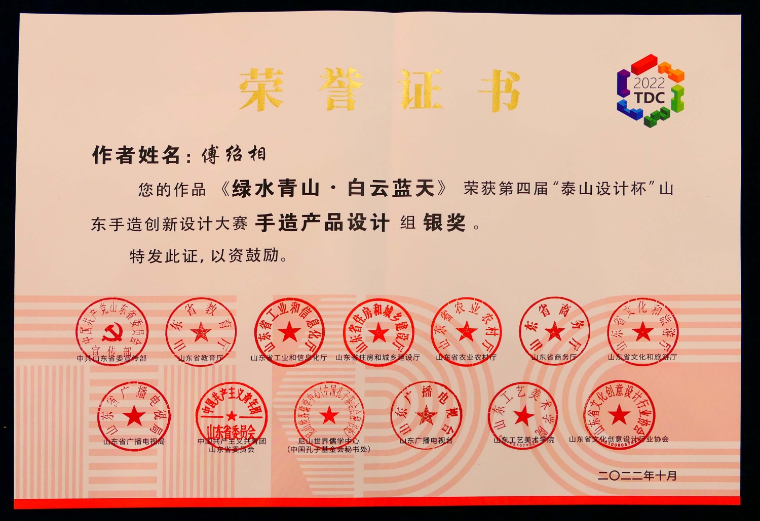 2022年9月16日,第四届“泰山设计杯”山东手造创新设计大赛颁奖典礼,在山东手造展示体验中心隆重举行。傅绍相作品《绿水青山•白云蓝天》荣获第四届“泰山设计杯”山东手造创新设计大赛手造产品设计组“银奖”。