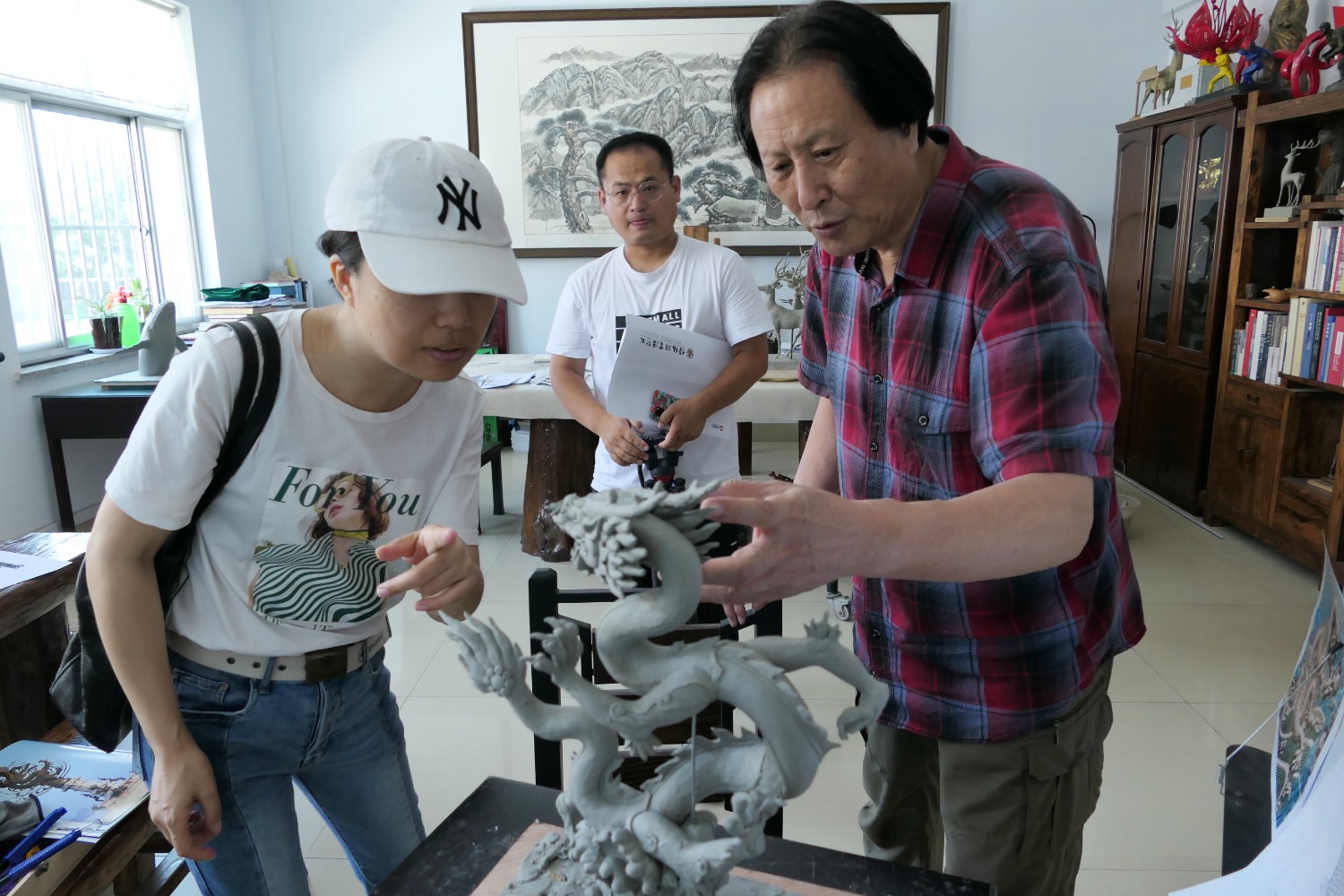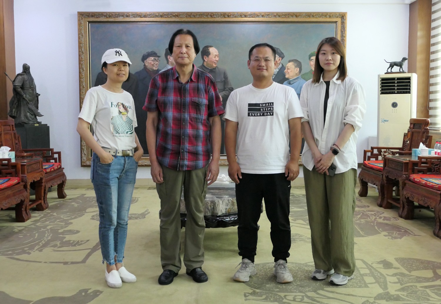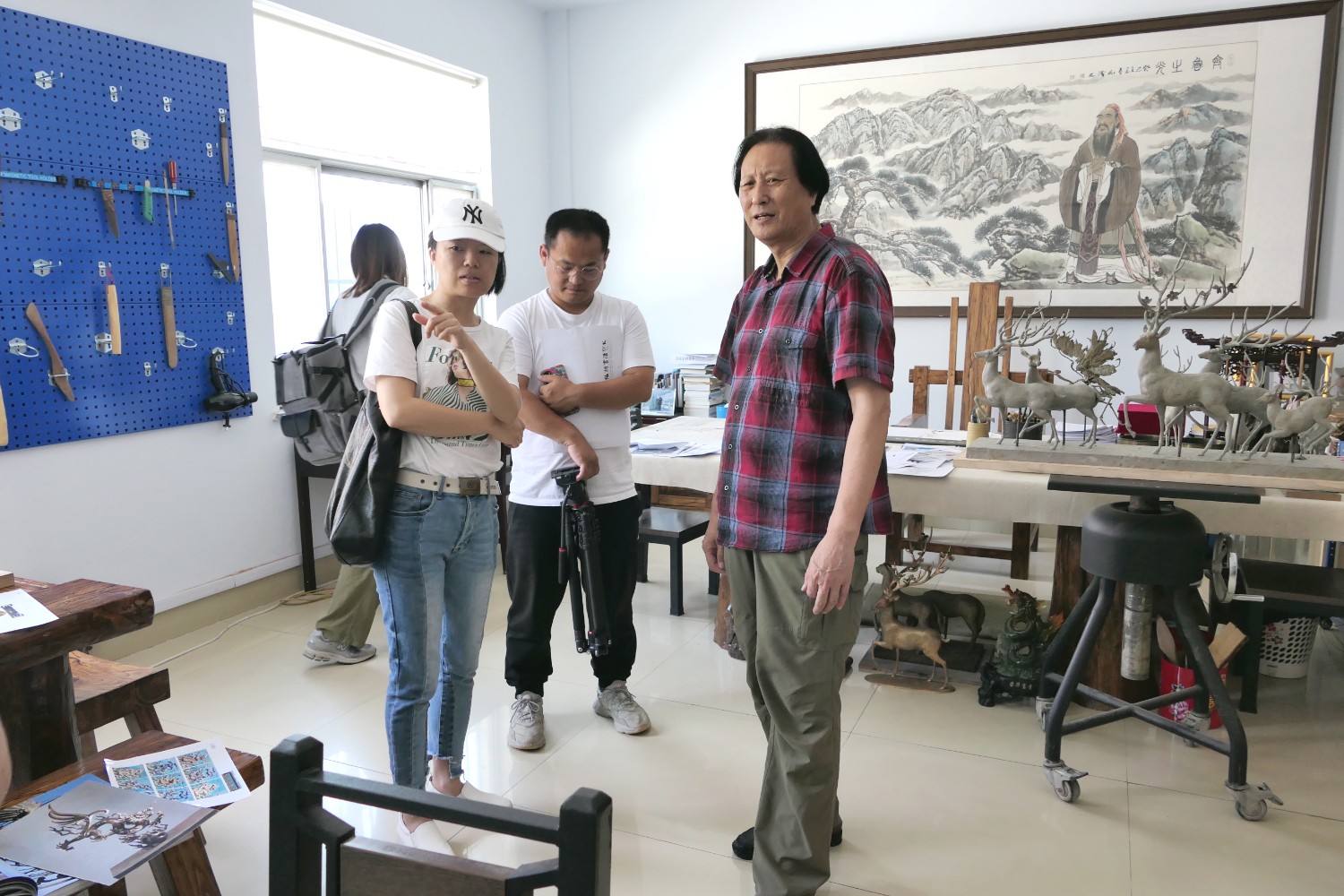 2023年6月21日,大众报业集团齐鲁晚报王赟工作室王赟主任、齐鲁晚报全媒体策划中心主编王建伟主任一行莅临华艺安博买球采访调研活动,傅绍相先生接受采访并介绍安博买球艺术。