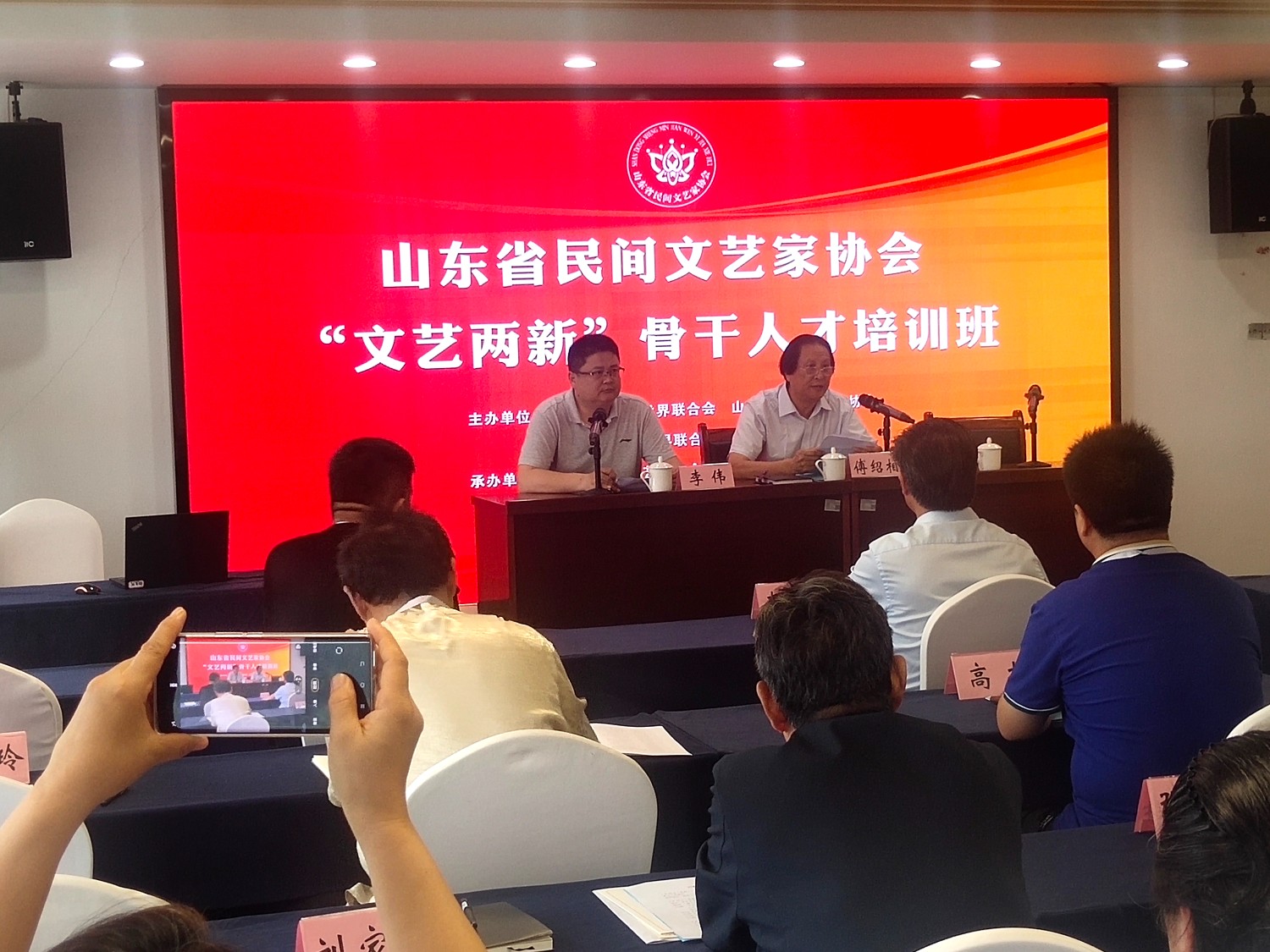 5月23日至26日,山东省民间文艺家协会“文艺两新”骨干人才培训班在临沂市顺利举办。山东省民协副主席、日照市民协主席邢葆东,山东省民协副秘书长、三级调研员高光华,山东省民协文艺两新工作委员会主任傅绍相,临沂市文联党组书记、主席战祥春,临沂市文联办公室主任、临沂市民协主席徐志强出席开班式。来自全省各市民协推荐的“文艺两新”骨干代表、省民协“文艺两新”工作委员会成员及当地“文艺两新”创作骨干代表等50余人参加培训。培训班邀请到临沂市委党校副校长杨建中教授,临沂市委党校文史教研部副主任刘柯薇副教授,省民协副主席、青岛科技大学朱纪副教授,省民协主席团委员、山东工艺美术学院人文艺术学院荣新副教授等四位教员,重点围绕“党的二十大精神学习”和“提升文艺精品创作”等主题,精选《党的二十大精神专题》《沂蒙精神专题》《非遗保护与文创设计》《民间文艺主题创作创新发展的思考》等课程为学员进行现场专题授课,各领域、各地区“文艺两新”人才齐聚一堂,互动交流。