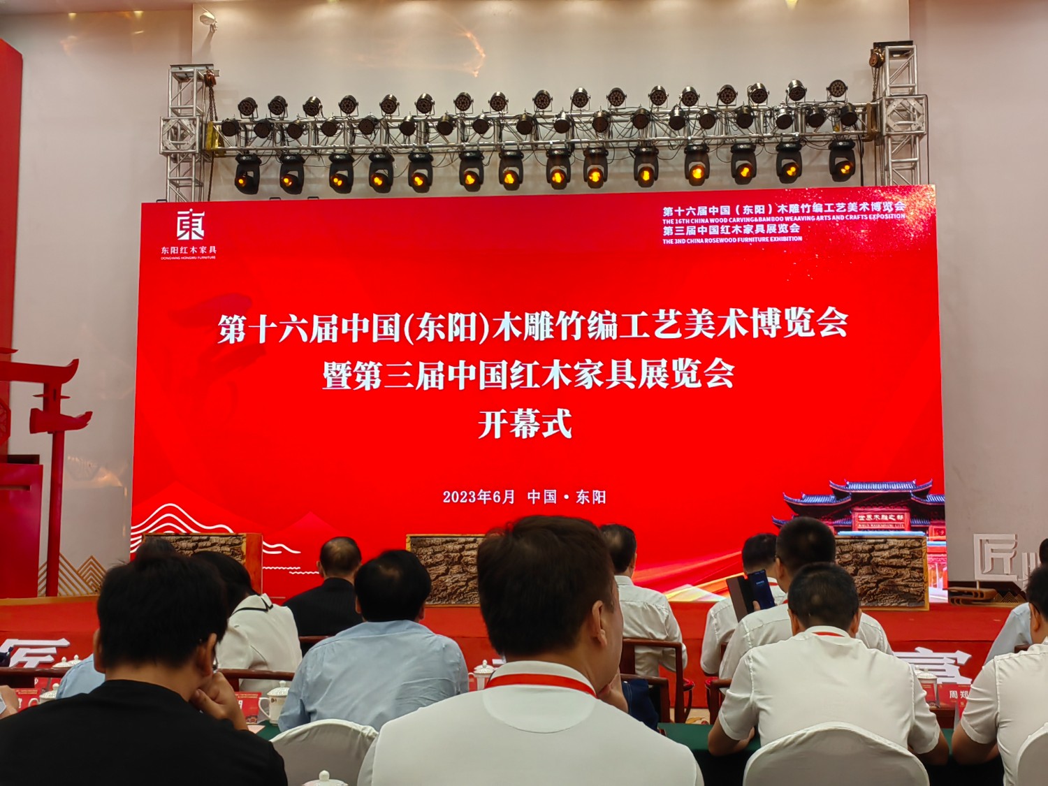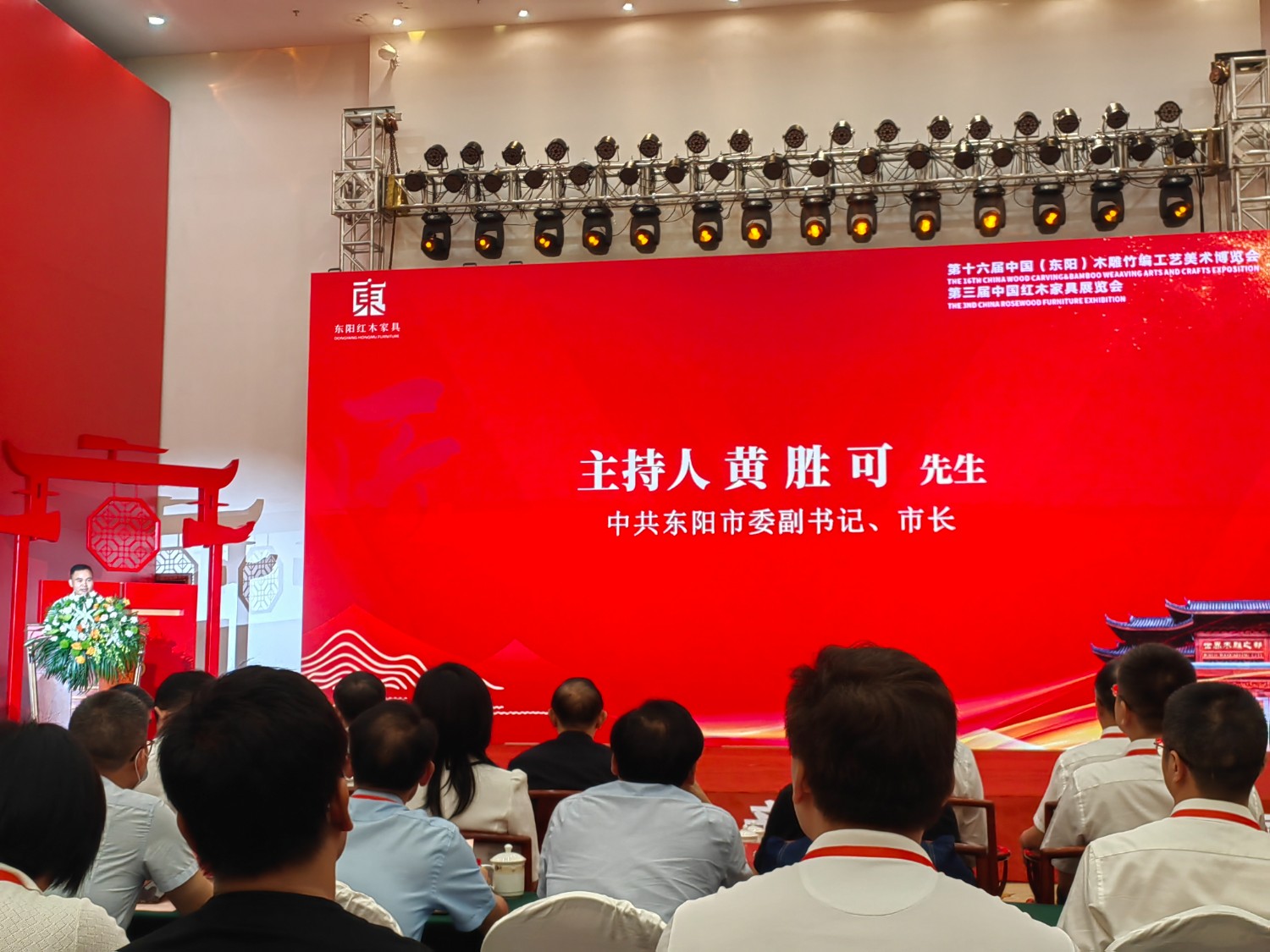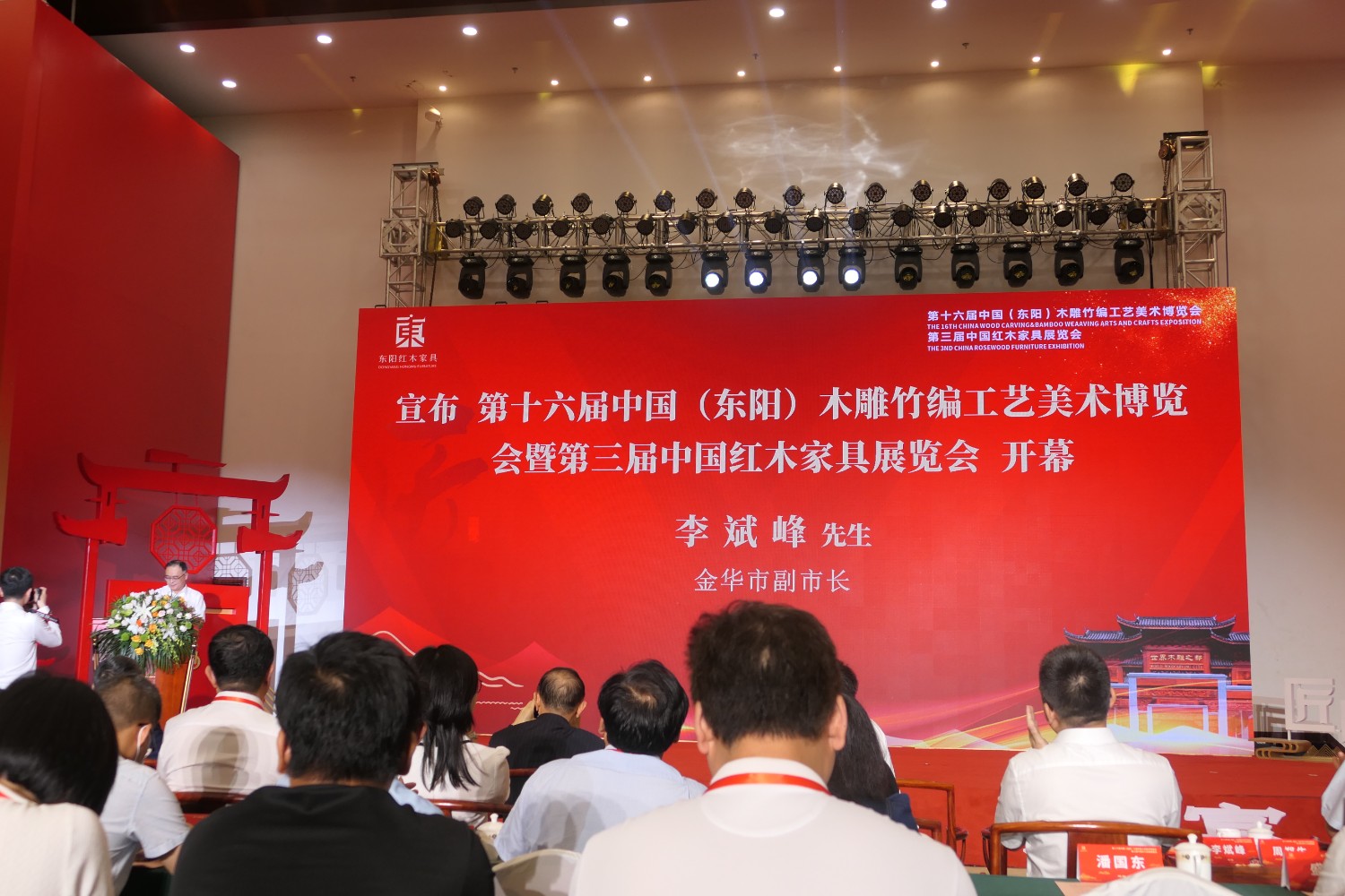 李斌峰宣布第十六届中国(东阳)木雕竹编工艺美术博览会暨第三届中国红木家具展览会开幕。