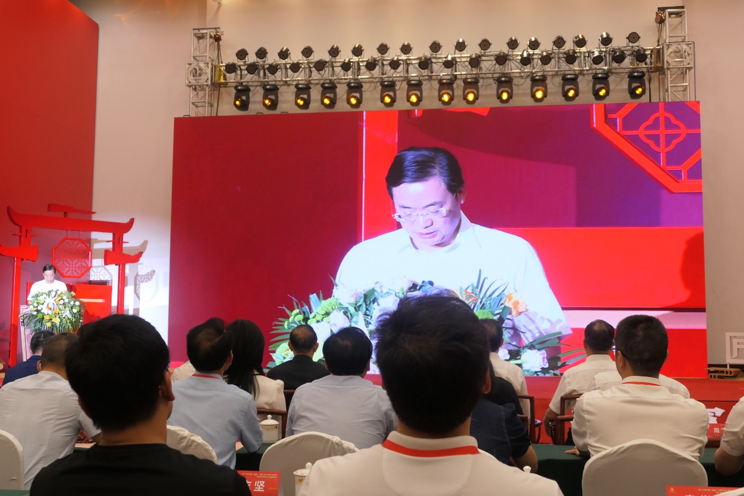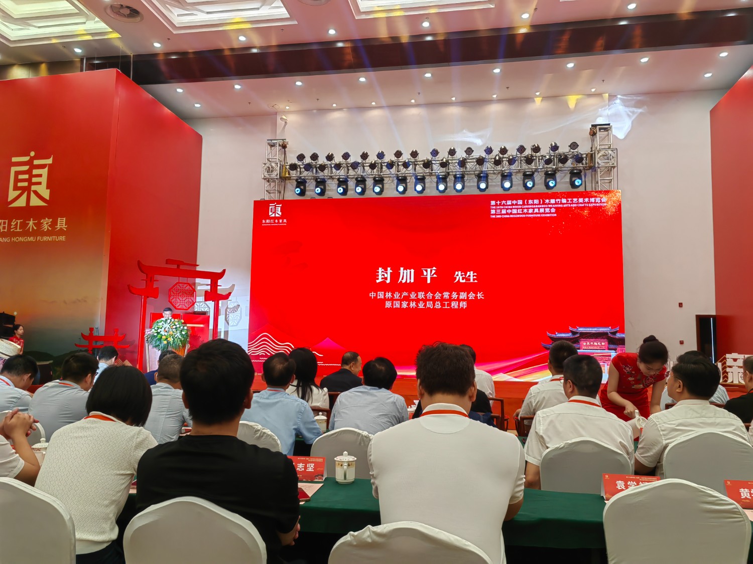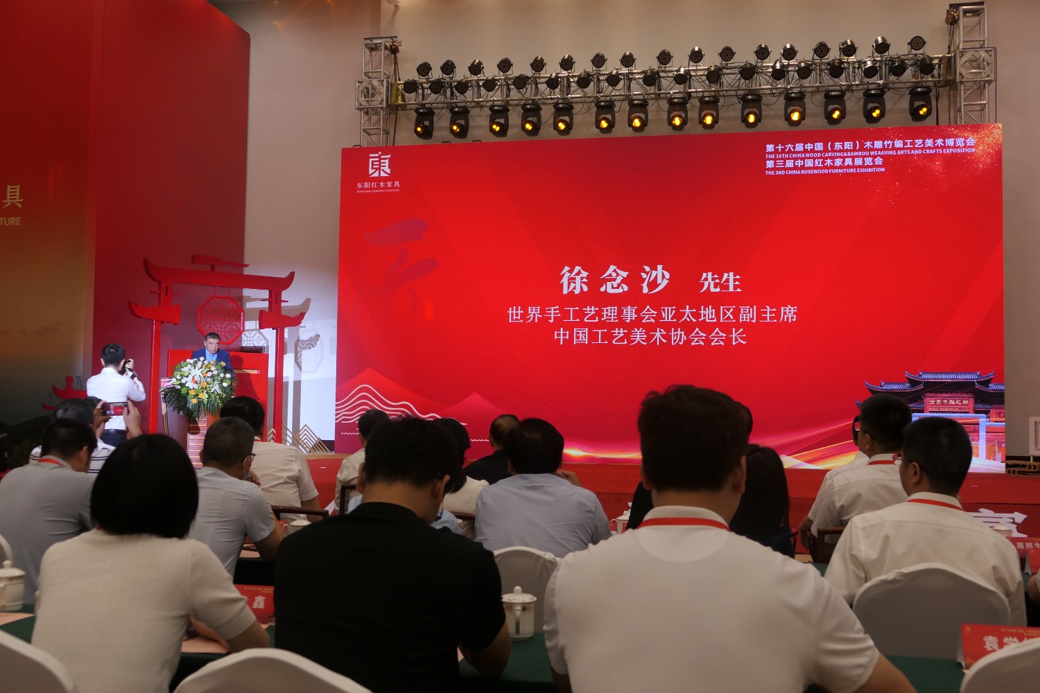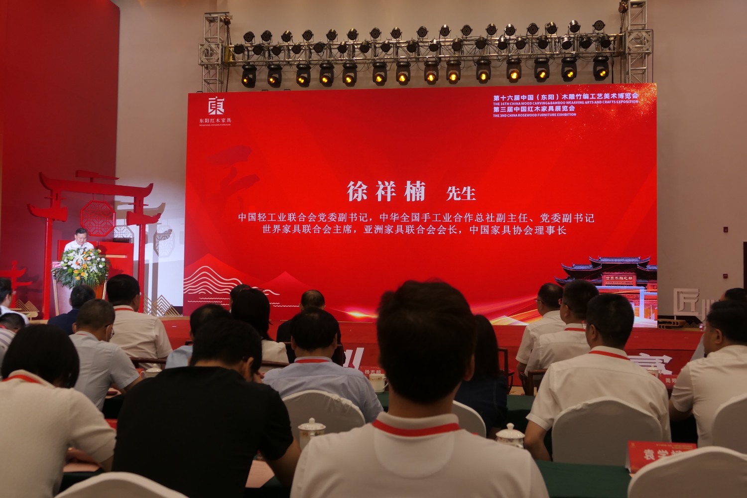 李斌峰宣布第十六届中国(东阳)木雕竹编工艺美术博览会暨第三届中国红木家具展览会开幕。