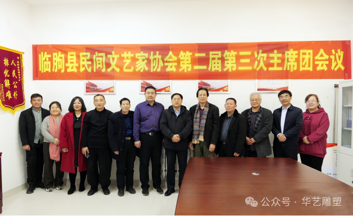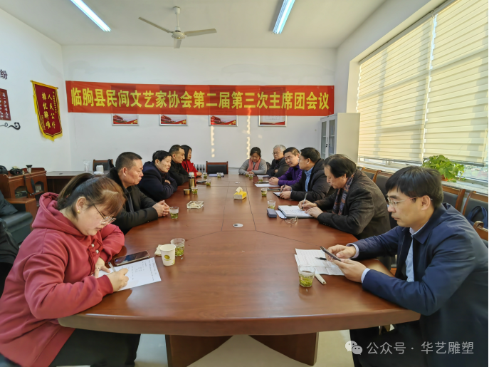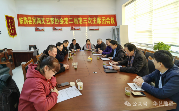 2024年1月27日,临朐县民间文艺家协会在冶源召开第二届第三次主席团会议,县文联社科联党组书记、主席张克奇莅临现场并讲话。参加会议的人员有:临朐县民间文艺家协会主席傅绍相,常务副主席兼秘书长刘文远,副主席连恩平、范文刚、赵永德、郑成双;副秘书长谭建伟、蒋静、季韦韦、孙秀华。会议由常务副主席秘书长刘文远主持。首先,由副秘书长谭建伟作2023年度财务工作报告;第二项,根据协会发展需要,报请县文联批准,选举增补了刘广海同志为民协副主席。第三项,县民协主席傅绍相汇报2023年度协会的工作发展及活动情况。傅主席讲话中说,今年我们民协成功举办了“乡村振兴齐鲁样板—产业兴旺有好戏”2023(临朐好手艺)民间艺术•工艺美术精品展销会暨首届临朐(舟超杯)设计创新大赛,得到了省市县各级领导和协会领导的充分肯定和认可。省市有关领导在参观现场时说,此次大展由县民协成功举办,这在潍坊市还是空前的,这是一个很好地开端!此次展览实现了老中青艺术家,同台献艺,国大师、省大师、市大师代表性作品齐聚,是一次八仙过海、各显其能的艺术交流盛会,充分体现了“山东手造”技艺的创新发展,彰显了临朐民间艺术的学术性和独特性。