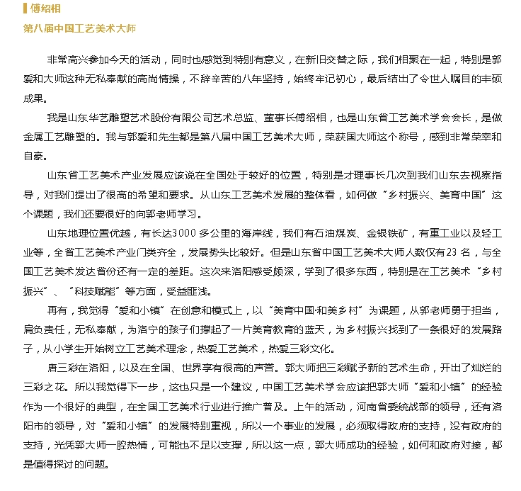 活动期间,举办了“工艺·公益——中国工艺美术大师论坛”,以“中国工艺美术大师的社会责任与使命担当”为主题进行交流。中国工艺美术学会党委书记、理事长才大颖做了开题报告,与会的各位中国工艺美术大师先后发言,论坛由中国工艺美术学会党委副书记王建良主持。中国工艺美术大师傅绍相出席活动,并在“工艺·公益——中国工艺美术大师论坛”讲话发言,晚上参观了洛阳古城丽景门古街。