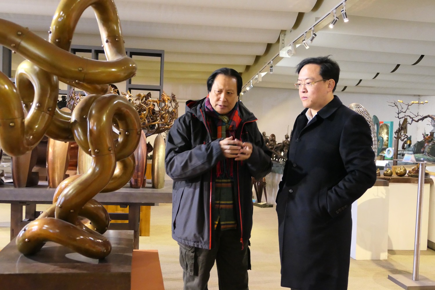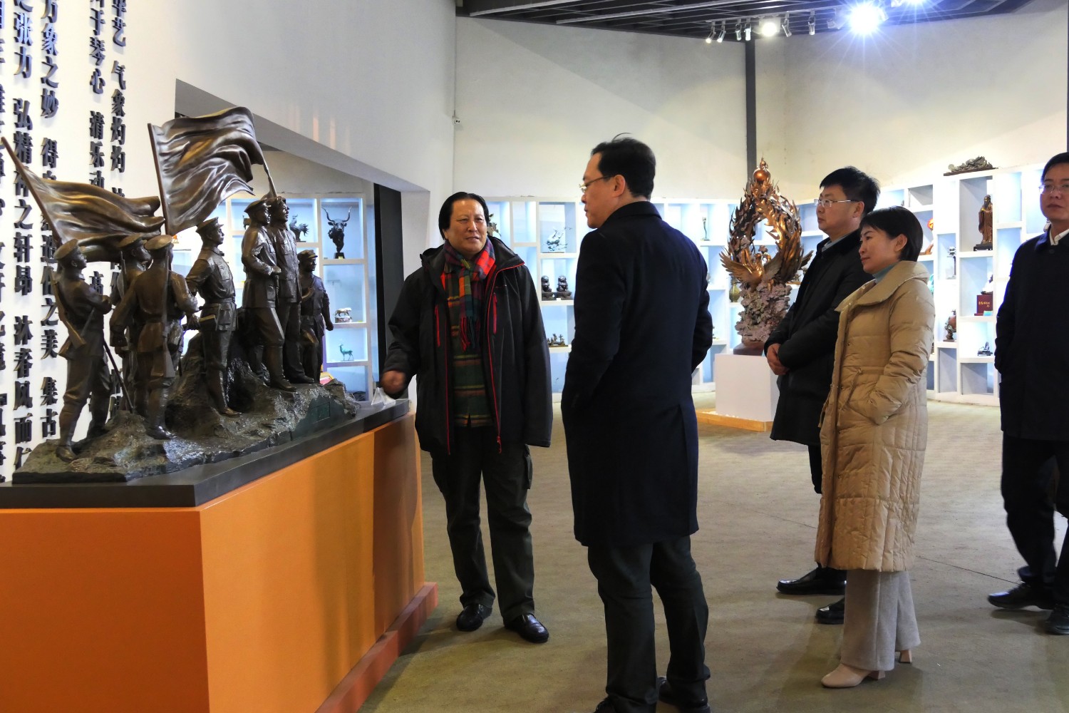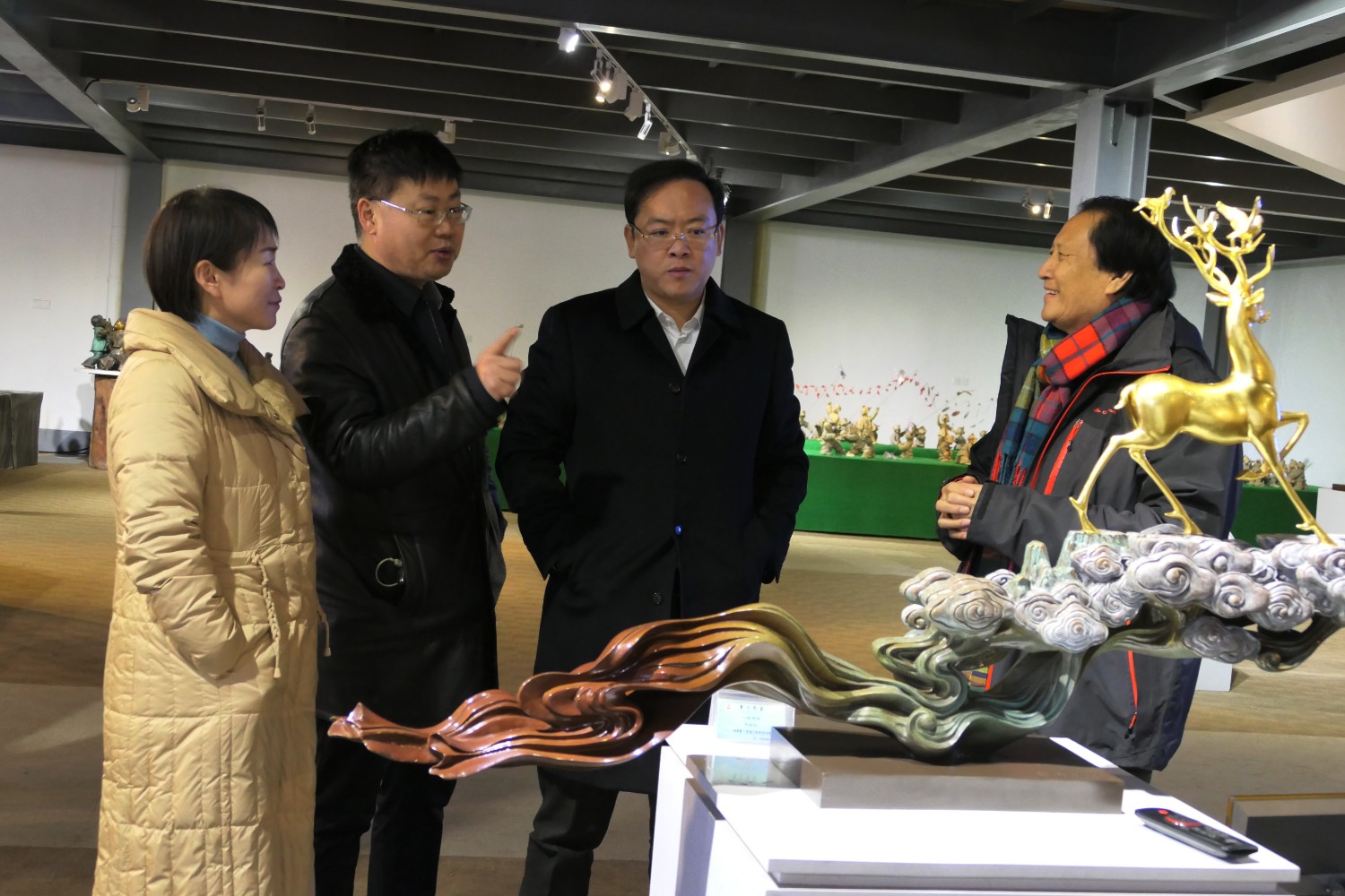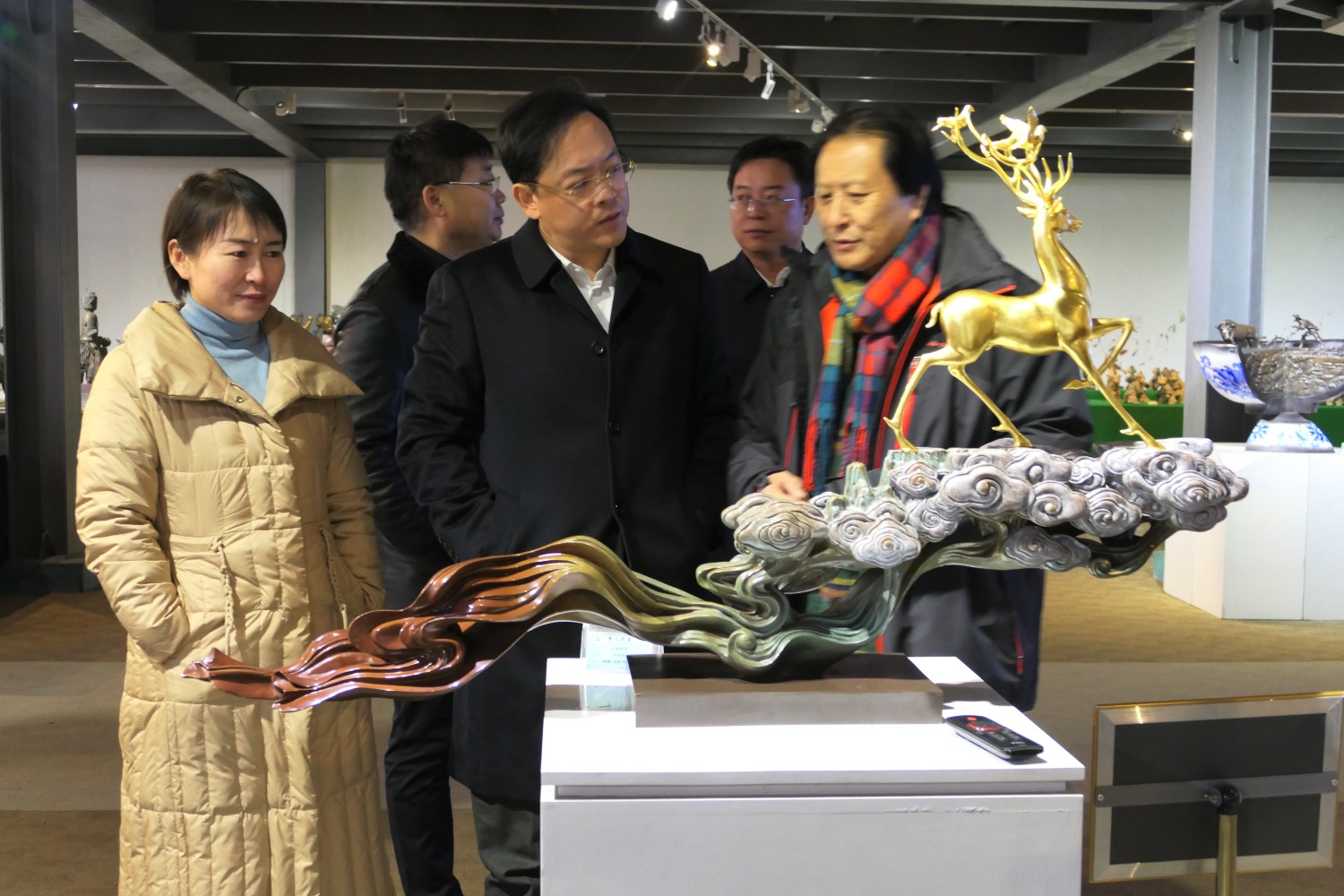 2023年12 月20日,中咨公司东北振兴专家组副组长、中咨产融副总经理兼纪委书记赵金财、北京市山东商会副会长彭德军一行10人,在潍坊市委常委、临朐县委书记刘艳芳,临朐县委副书记李飞雨的陪同下,莅临华艺安博买球参观指导,中国工艺美术大师傅绍相向嘉宾介绍安博买球艺术。