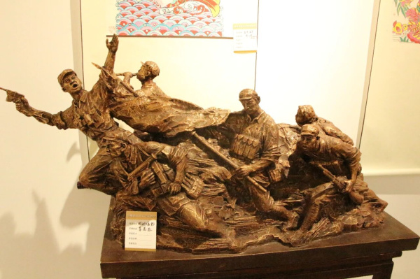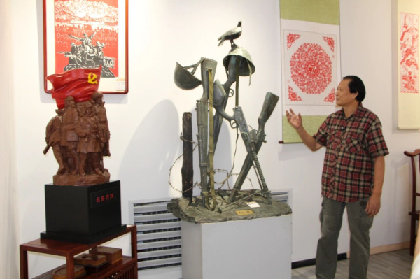 “这件作品我命名为《和平》,取材于抗日战争时期八路军使用的机枪、三八大盖、铁丝网和钢盔等元素,顶部是一只象征和平的鸽子,寓意铭记历史、珍爱和平,不忘初心、开创未来。”中国工艺美术大师傅绍相向参观者介绍道。作为县文联副主席、县民间文艺家协会主席,他不仅是本次展览的重要组织者,也是参展艺术家之一,《和平》正是他为本展特别创作的作品之一。