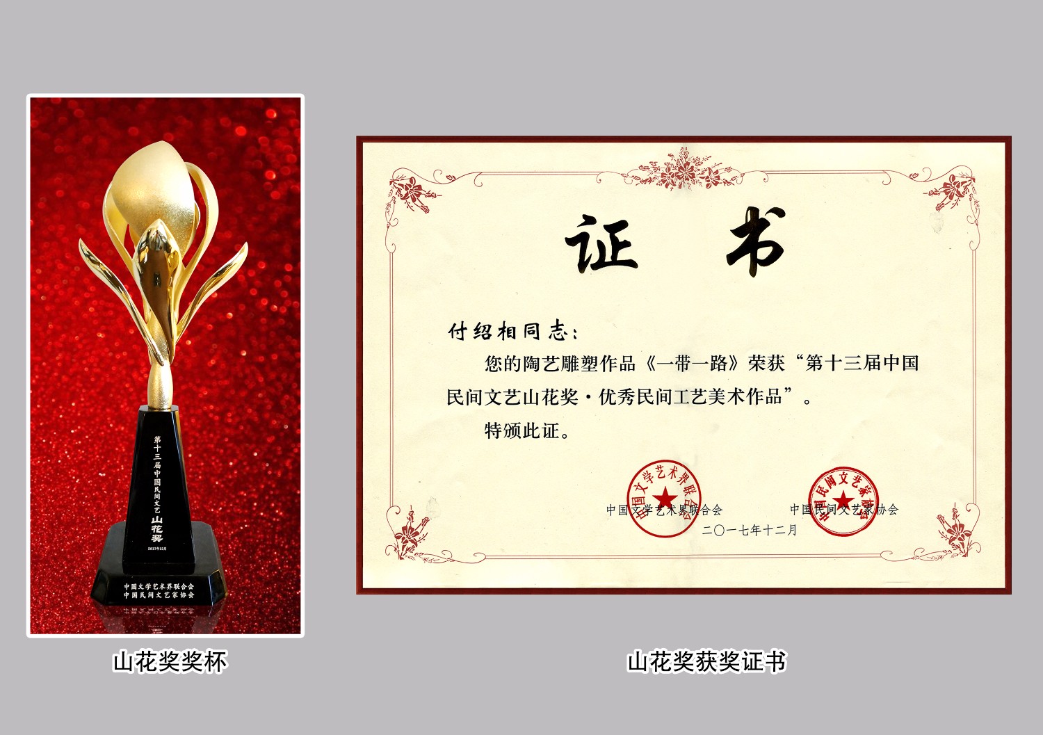 第十三届中国民间文艺“山花奖”共评出获奖作品20个,其中杰出的民间艺术表演5个、精美的民间工艺美术作品8个、卓越的民间文学作品3个、优异的民间文艺学术著作4个。傅绍相作品《一带一路》荣获中国民间文艺“山花奖”,成为山东省近年来仅有获此殊荣的杰出民间工艺美术作品。