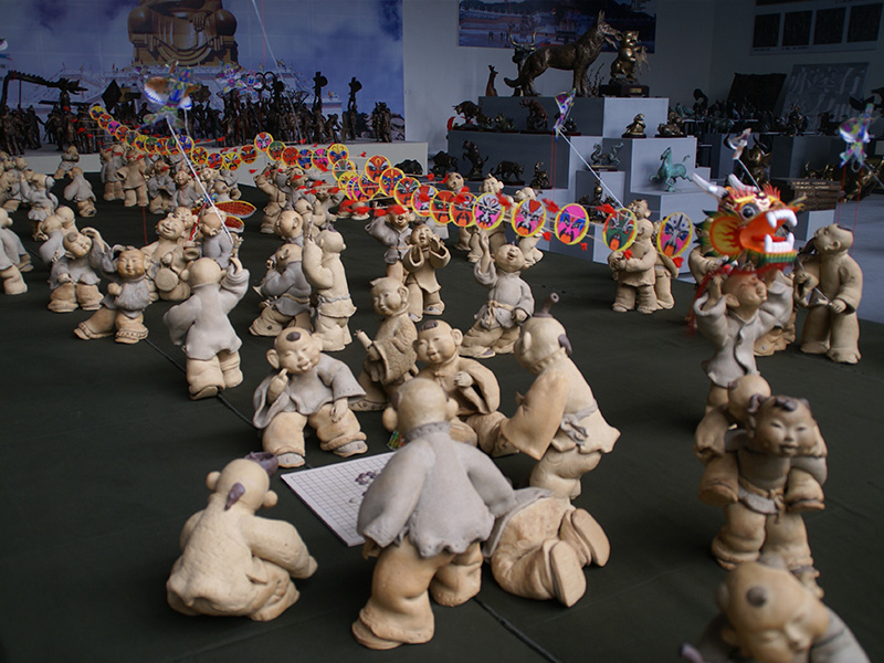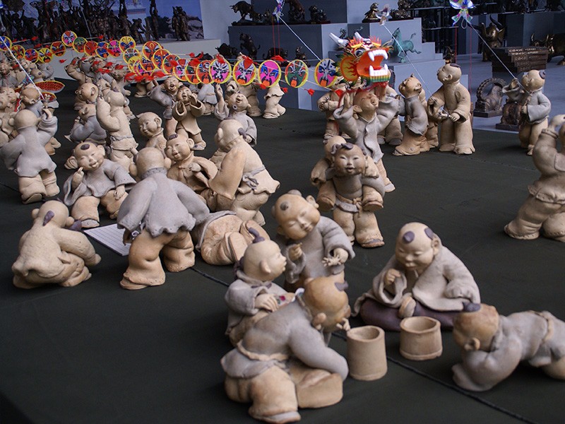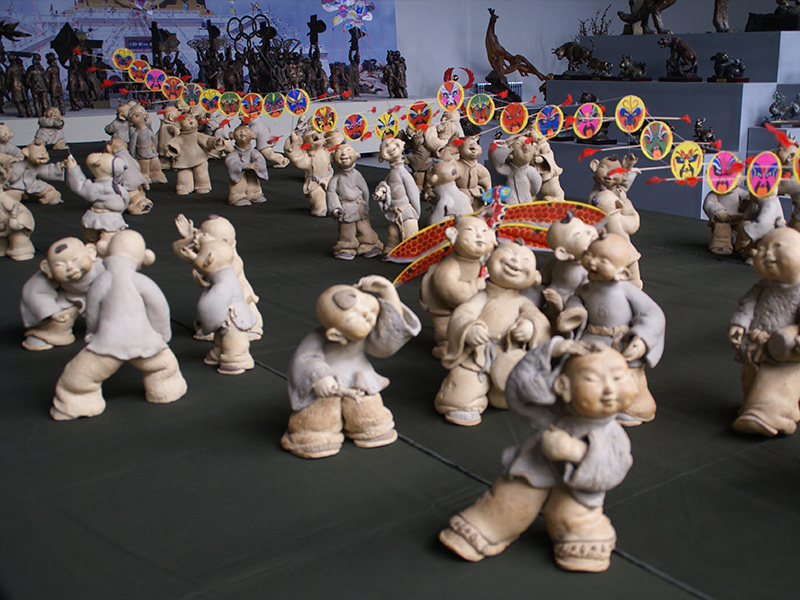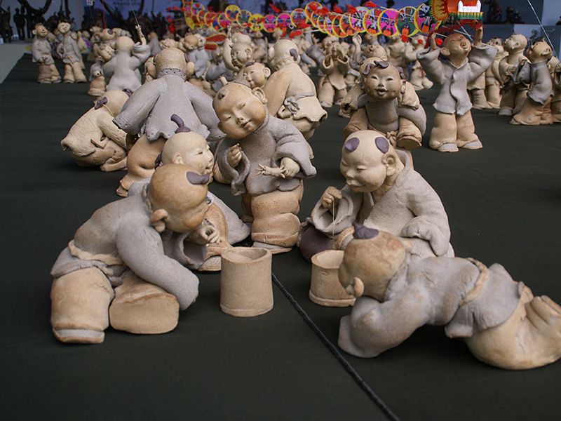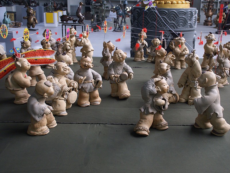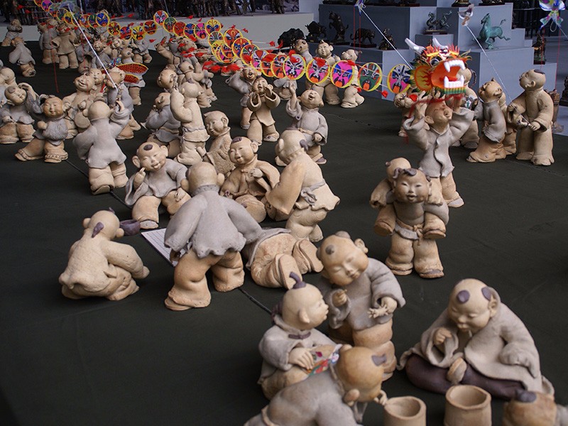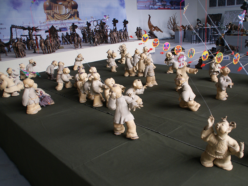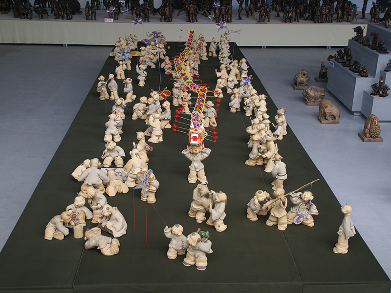 象逼真、活灵活现、栩栩如生、神采飞扬、立体感强,构成了一幅内涵丰富的风筝文化画卷。中间飘舞着一条长8米的彩色龙头蜈蚣风筝,巨龙腾飞代表中华民族伟大复兴的中国梦,龙身风片共56片,代表全国五十六个民族大团结。天空点缀着各式各样的彩色风筝,形成了一个热烈欢庆的闹鸢大场景。强烈的民间艺术氛围,夸张装饰的陶艺安博买球展现,充分显示了潍坊传统文化的深厚底蕴和风筝文化的广泛影响,从而诠释了孩子们对风筝文化的无限喜爱及对未来的美好向往和憧憬。